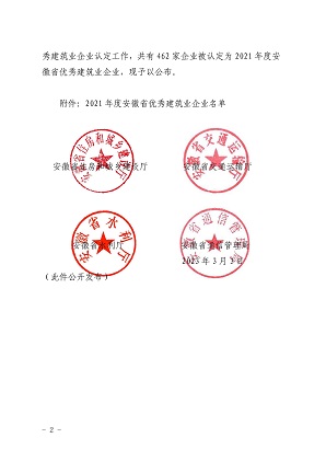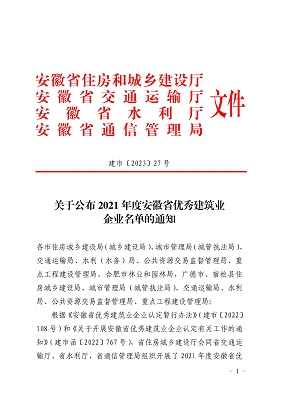 根據《安徽省優(yōu)秀建筑業(yè)企業(yè)認定暫行辦法》和《關于開展安徽省優(yōu)秀建筑業(yè)企業(yè)認定有關工作的通知》。省住房城鄉(xiāng)建設廳會同省交通運輸廳、省水利廳、省通信管理局組織開展了2021年度安徽省優(yōu)秀建筑企業(yè)認定工作。