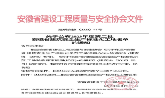 8月17日,安徽省建設(shè)工程質(zhì)量與安全協(xié)會發(fā)布2023年度第二批安徽省建筑安全生產(chǎn)標(biāo)準(zhǔn)化工地名單,黃山建工集團(tuán)仙人洞南路東側(cè)D1地塊(文瀾軒)項(xiàng)目獲評“安徽省建筑安全生產(chǎn)標(biāo)準(zhǔn)化工地”。